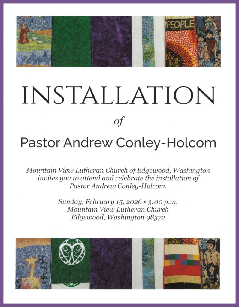 Mountain View Lutheran Church of Edgewood, Washington invites you to attend and celebrate the installation of Pastor Andrew Conley-Holcom. Sunday, February 15, 2026 • 3:00 p.m.Mountain View Lutheran Church3505 – 122nd Avenue EastEdgewood, Washington 98372 Rostered clergy (pastors and deacons) in attendance are asked to vest in red.